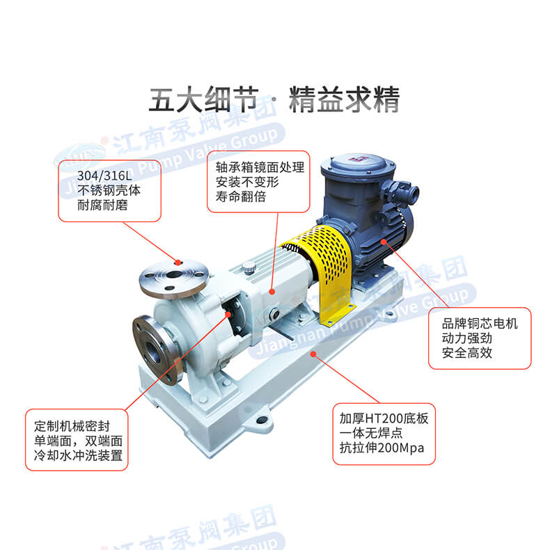 - JIH-HX不銹鋼耐腐蝕離心泵高效節(jié)能、抗汽蝕性能強,適用溫度范圍廣。具有運行穩(wěn)定、噪音振動低、可靠性高、壽命長等優(yōu)點,是堿液、醇類、各種有機溶劑等介質(zhì)的理想輸送設(shè)備。