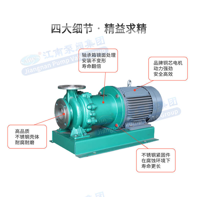 - 安徽江南泵閥制造的不銹鋼磁力泵,耐腐性強,高效節能,耐高溫,磁性強,全密封,無泄漏,靜音振低,可代替進口等優點。