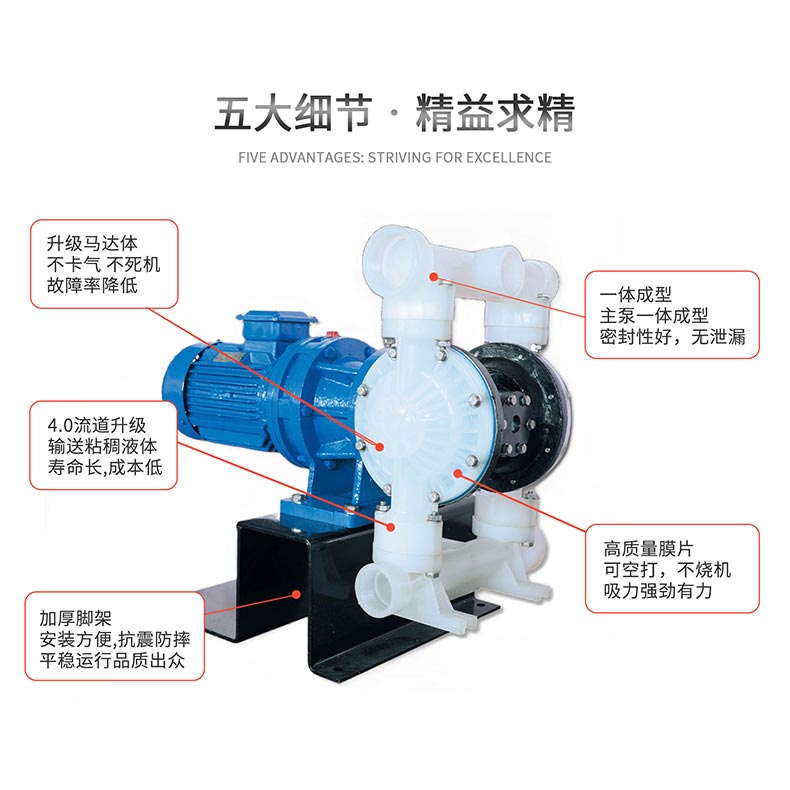 - 2、電動隔膜泵品種多,泵體介質過流部分,可根據用戶要求不同,分為鑄鋼、不銹鋼、鋁合金、氟塑料等,隔膜泵電機可分為普通電機、防爆電機、變頻電機和電磁調速電機;