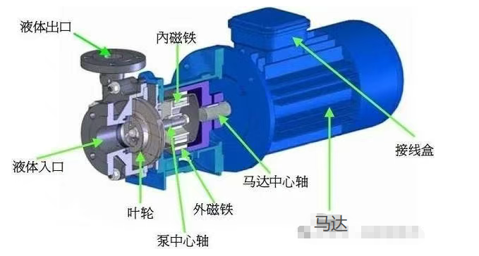 磁力泵是一種利用磁力傳動(dòng)原理來(lái)實(shí)現(xiàn)無(wú)泄漏輸送液體的泵。其核心部件是磁性聯(lián)軸器,由內(nèi)外磁鋼組成。當(dāng)電機(jī)帶動(dòng)外磁鋼旋轉(zhuǎn)時(shí),通過(guò)磁場(chǎng)作用,帶動(dòng)與內(nèi)磁鋼相連的葉輪同步旋轉(zhuǎn),從而實(shí)現(xiàn)液體的吸入和排出。由于不存在軸封,磁力泵具有良好的密封性能,能有效避免液體泄漏,常用于輸送腐蝕性、易燃易爆、有毒等特殊液體。如下圖: